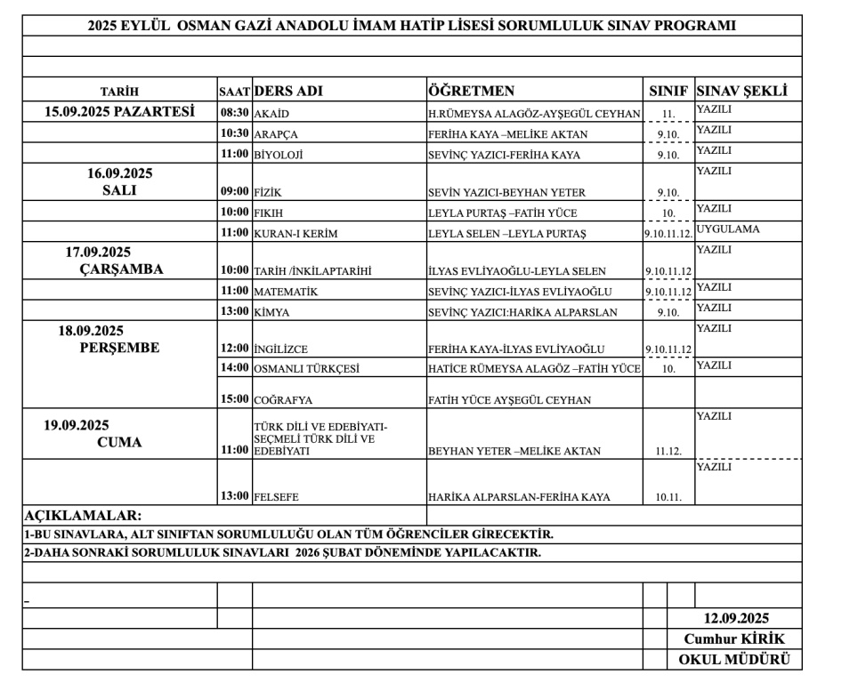2025 Eylül dönemi Osman Gazi Anadolu İmam Hatip Lisesi Sorumluluk Sınav Programı aşağıdaki takvime göre uygulanacaktır.