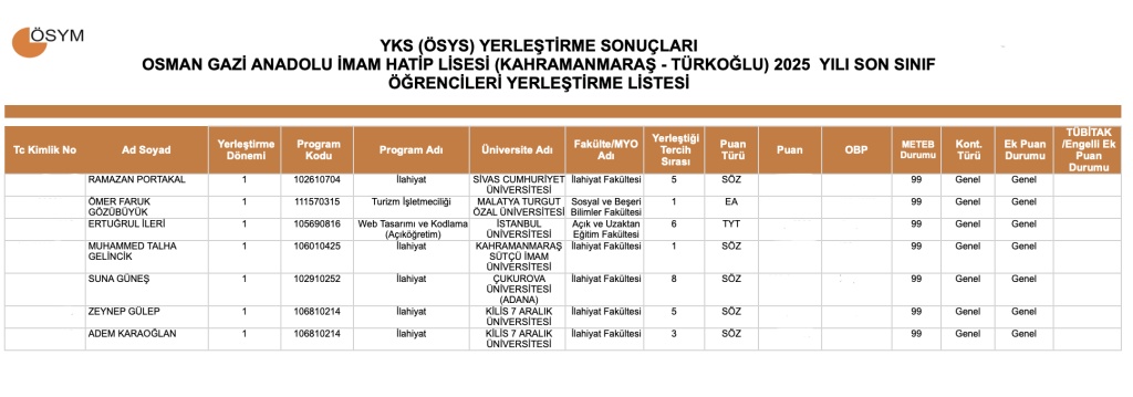 2025 Yükseköğretim Kurumları Sınavı (YKS) sonuçlarına göre, Osman Gazi Anadolu İmam Hatip Lisesi son sınıf öğrencileri önemli bir başarıya imza attı. Öğrencilerimiz, farklı üniversite ve bölümlere yerleşerek hem ailelerini hem de okulumuzu gururlandırdı.